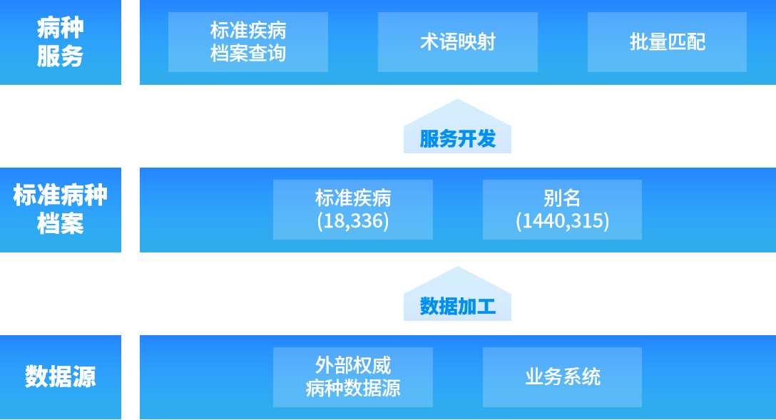 沒(méi)有統(tǒng)一標(biāo)準(zhǔn)的病種數(shù)據(jù),導(dǎo)致的核心問(wèn)題主要為基于病種開(kāi)展的相關(guān)數(shù)據(jù)分析復(fù)雜且不準(zhǔn)確,分析人員需要將多種不規(guī)范的病種描述轉(zhuǎn)譯成統(tǒng)一名稱(chēng)開(kāi)展數(shù)據(jù)分析,從而導(dǎo)致分析工作的時(shí)間周期長(zhǎng)及分析不準(zhǔn)確的問(wèn)題,因此疾病分類(lèi)主數(shù)據(jù)建設(shè)的主要目標(biāo)為建立標(biāo)準(zhǔn)的疾病分類(lèi)檔案庫(kù),并可提供便捷的匹配服務(wù),以便更好地支持基于病種進(jìn)行用戶(hù)數(shù)據(jù)分析,以及后續(xù)開(kāi)展病種知識(shí)庫(kù)建設(shè)形成病種知識(shí)庫(kù)建設(shè)的數(shù)據(jù)基礎(chǔ)。