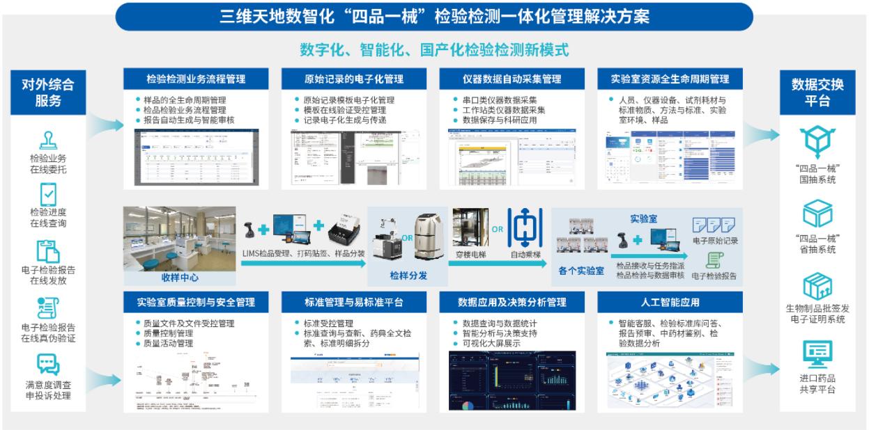針對(duì)“四品一械”檢驗(yàn)檢測(cè)機(jī)構(gòu),三維天地打造的一站式數(shù)字化解決方案(管理平臺(tái))集檢驗(yàn)檢測(cè)業(yè)務(wù)管理、原始記錄電子化管理、儀器數(shù)據(jù)自動(dòng)采集管理、實(shí)驗(yàn)室資源全生命周期管理、實(shí)驗(yàn)室質(zhì)量控制與安全管理、對(duì)外綜合服務(wù)管理等于一體,實(shí)現(xiàn)檢驗(yàn)業(yè)務(wù)的全面數(shù)字化和標(biāo)準(zhǔn)化,正在致力于檢驗(yàn)檢測(cè)機(jī)構(gòu)形成全面的檢驗(yàn)檢測(cè)數(shù)據(jù)資產(chǎn),并充分結(jié)合大數(shù)據(jù)和人工智能技術(shù),為質(zhì)量安全監(jiān)管賦能。