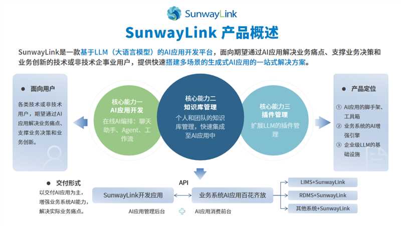 SunwayLink是一款基于LLM(大語言模型)的AI應(yīng)用開發(fā)平臺,面向期望通過AI應(yīng)用解決業(yè)務(wù)痛點、支撐業(yè)務(wù)決策和業(yè)務(wù)創(chuàng)新的技術(shù)或非技術(shù)企事業(yè)用戶,提供快速搭建多場景的生成式AI應(yīng)用的一站式解決方案。可以提供聊天助手、智能體、工作流三種應(yīng)用開發(fā)能力,開發(fā)好的應(yīng)用可快速封裝為API,可由后端或前端應(yīng)用直接調(diào)用,提供基于RAG(檢索增強生成)技術(shù)的可視化知識庫構(gòu)建能力,快速接入結(jié)構(gòu)化和非機構(gòu)化數(shù)據(jù)構(gòu)建個人和企業(yè)知識庫。