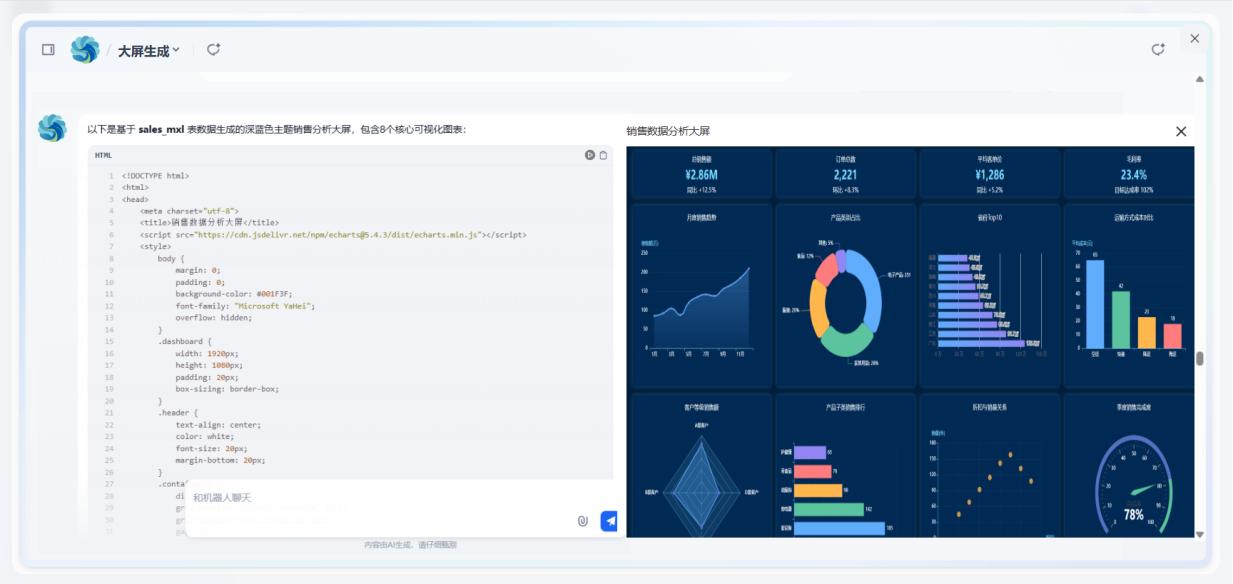 應(yīng)用于數(shù)據(jù)分析大屏智能體,可根據(jù)用戶問題,調(diào)用數(shù)據(jù)計算分析工具,代碼生成工具,精準(zhǔn)生成完整的數(shù)據(jù)大屏應(yīng)用,大幅提升開發(fā)效率,使數(shù)據(jù)可視化開發(fā)更智能高效。