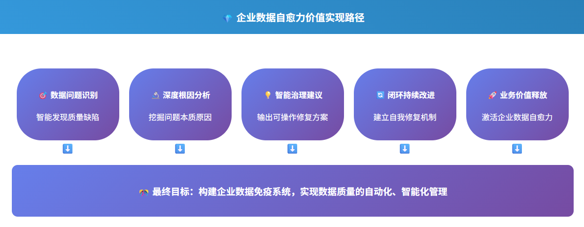 數(shù)據(jù)質(zhì)量智能體通過自然語言處理引擎解析報告中的復(fù)雜指標(biāo),將專業(yè)術(shù)語轉(zhuǎn)化為業(yè)務(wù)可讀性語言,自動標(biāo)注關(guān)鍵異常點并關(guān)聯(lián)歷史趨勢;結(jié)合知識庫中的業(yè)務(wù)場景模型,智能定位影響最大的質(zhì)量缺陷,通過可視化看板動態(tài)推演問題成因與業(yè)務(wù)影響路徑,最終輸出分級決策建議 —— 讓非技術(shù)角色也能秒懂?dāng)?shù)據(jù)健康度,驅(qū)動精準(zhǔn)治理行動。