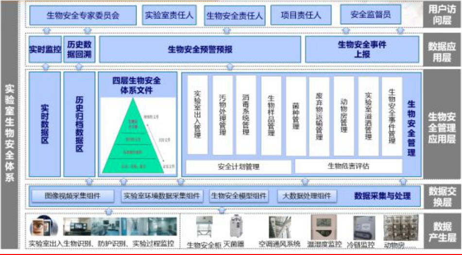 實(shí)驗(yàn)室生物安全管理平臺(tái)充分利用圖像與視頻數(shù)據(jù)采集、物聯(lián)網(wǎng)、大數(shù)據(jù)處理、人工智能等信息化技術(shù),為生物安全實(shí)驗(yàn)室的生物安全提供了更加智能的管理方式。同時(shí),生物安全管理平臺(tái)也為生物安全的各級(jí)主管單位、實(shí)驗(yàn)室責(zé)任人等提供了實(shí)時(shí)、可視化的生物安全管理手段。
