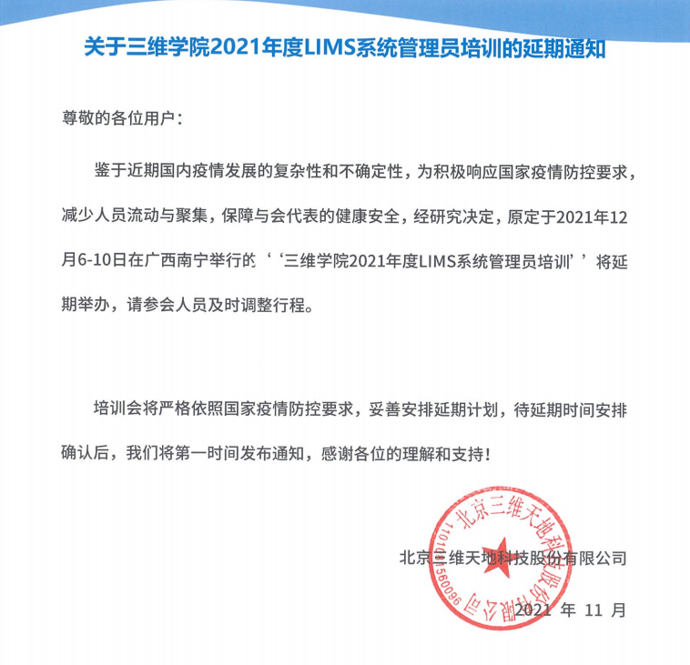 關(guān)于三維學(xué)院2021年度LIMS系統(tǒng)管理員培訓(xùn)的延期通知